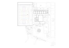doplňuje nižší hmota zázemí. Ta se nachází ve vnitrobloku školního nádvoří a její střechu